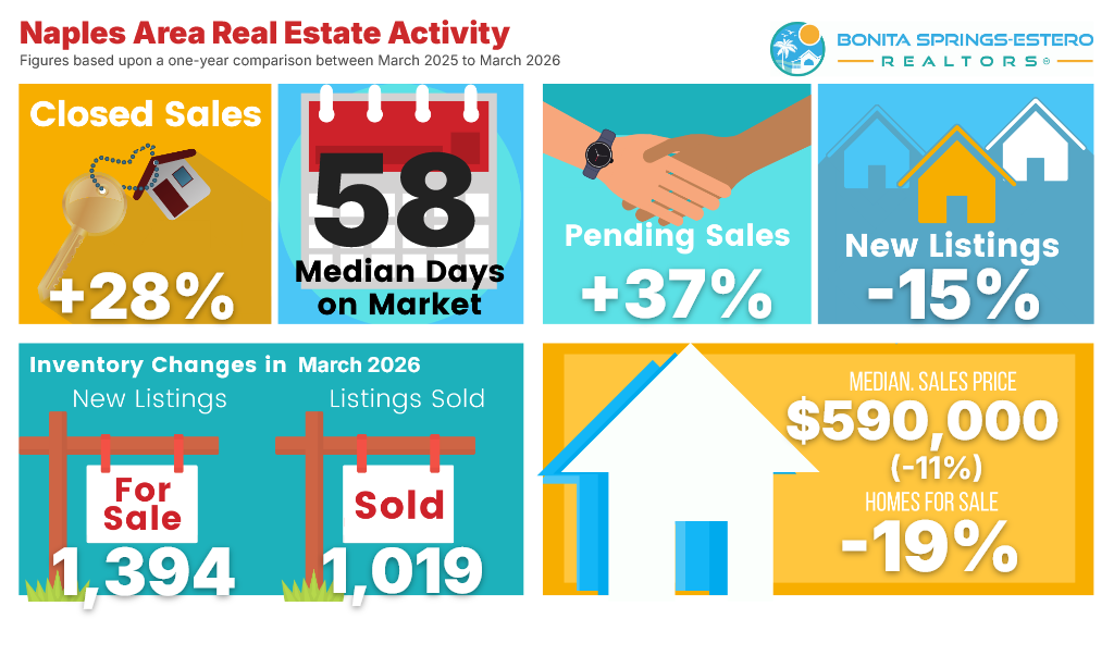 March 2026 delivered a clear peak-season signal: closed sales rose sharply, inventory tightened, and prices stayed selective across Bonita/Estero, Naples, and Fort Myers.