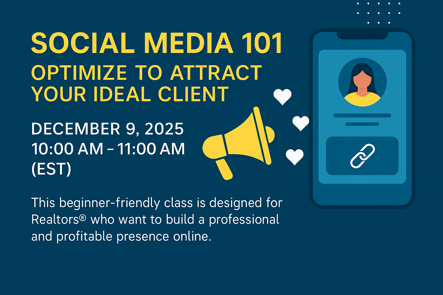 This beginner-friendly class is designed for Realtors® who want to build a professional and profitable presence online. You’ll walk away with an optimized social media profile, the right bio, links, and content approach to attract ideal clients.