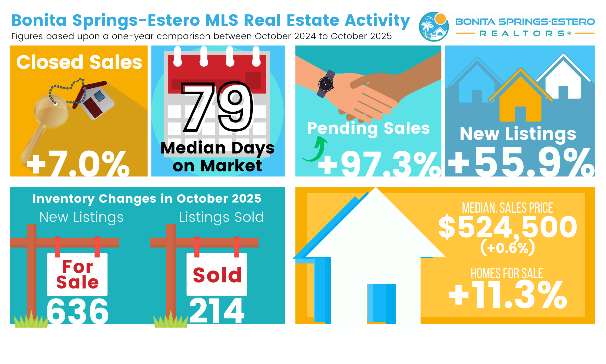 Southwest Florida’s October 2025 market snapshot shows closed and pending sales outpacing 2024, while inventory continues to build heading into high season. Recent Federal Reserve rate cuts are easing mortgage costs, improving affordability for buyers and supporting a more balanced but still competitive environment for sellers across Bonita Springs, Estero, and the wider Gulf Coast.