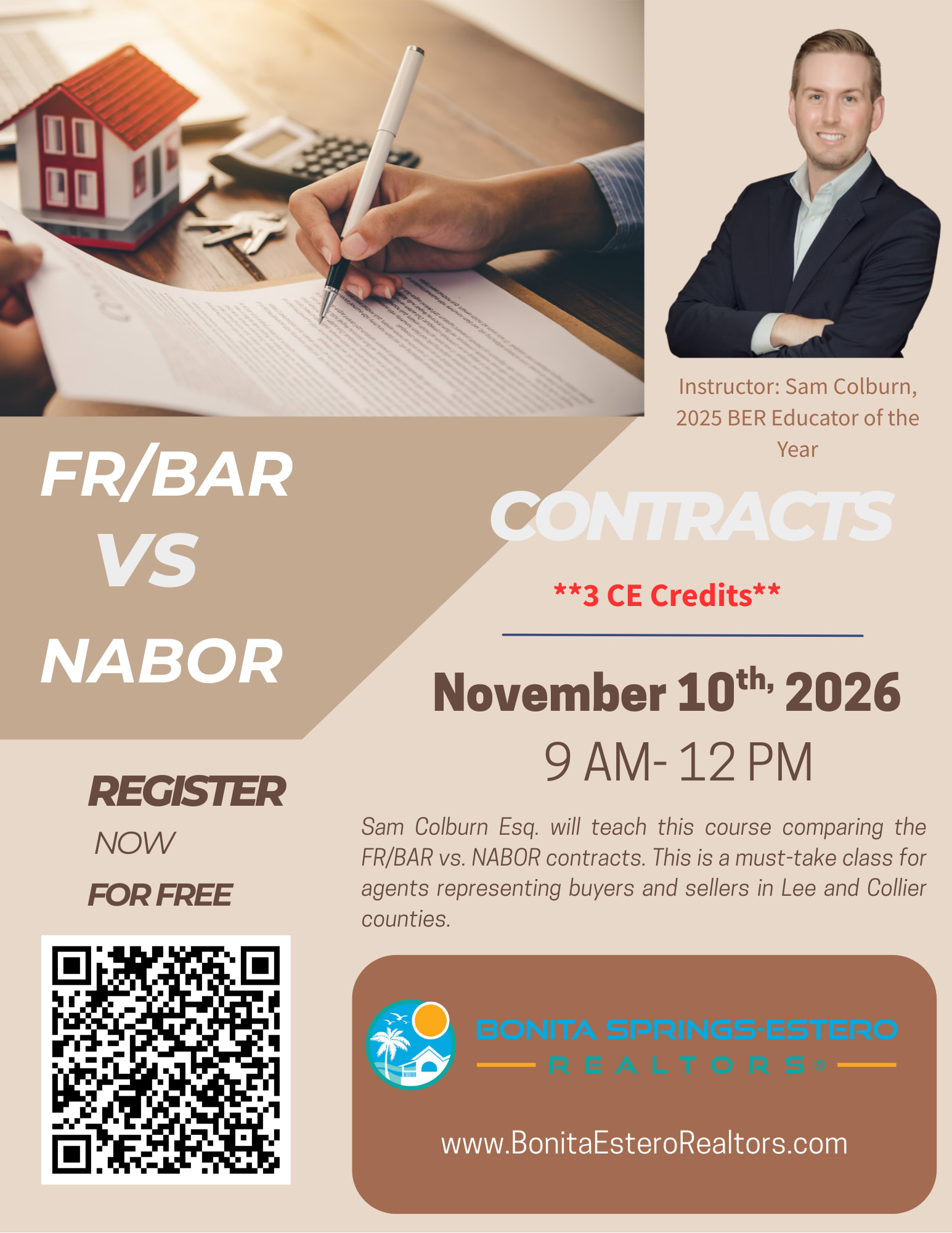 Sam Colburn Esq. will teach this course comparing the FR/BAR vs. NABOR contracts. This is a must-take class for agents representing buyers and sellers in Lee and Collier counties.