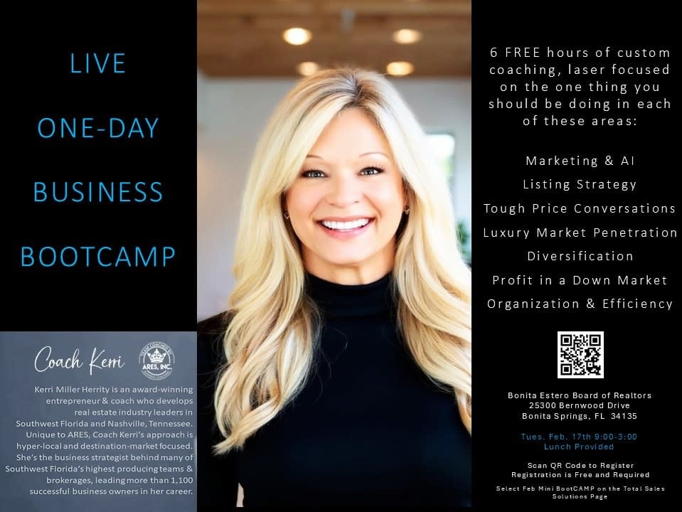 LIVE ONE-DAY BUSINESS BOOTCAMP with Coach Kerri Herrity! 6 FREE hours of custom coaching, laser focused on the one thing you should be doing in each of these areas: Marketing & AI, Listing Strategy, Tough Price Conversations, Luxury Market Penetration, Diversification, Profit in a Down Market, Organization & Efficiency