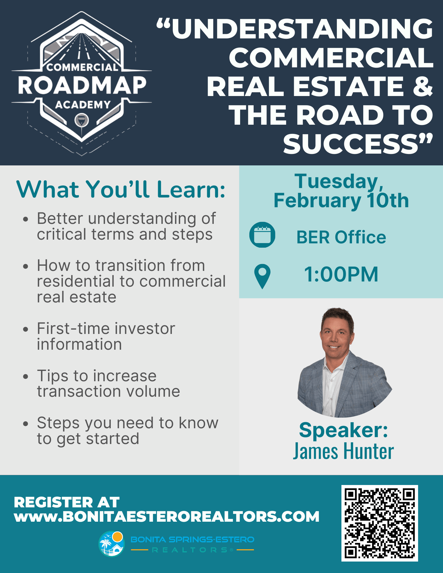 “Your Step-by-Step Guide to Commercial Real Estate Success.” James Hunter possesses extensive experience in commercial real estate, commercial banking, and financial analysis, driven by a genuine desire to assist others. Prior to his career in real estate, James successfully originated over $600M in commercial loans. Since transitioning to real estate, he has successfully been involved in over $100M in commercial transactions. He is eager to introduce a new course that will empower residential agents and first-time investors in navigating the exciting sector of commercial real estate and capitalizing on emerging opportunities. What I hope you take away from today! A better understanding of commercial real estate, including some crucial steps and terms to understand. This is essential for making a successful transition from residential to commercial real estate transactions. This information is also great for first-time investors seeking to increase their transaction volume or have a better understanding of what they need to know to start. Instructor: James Hunter