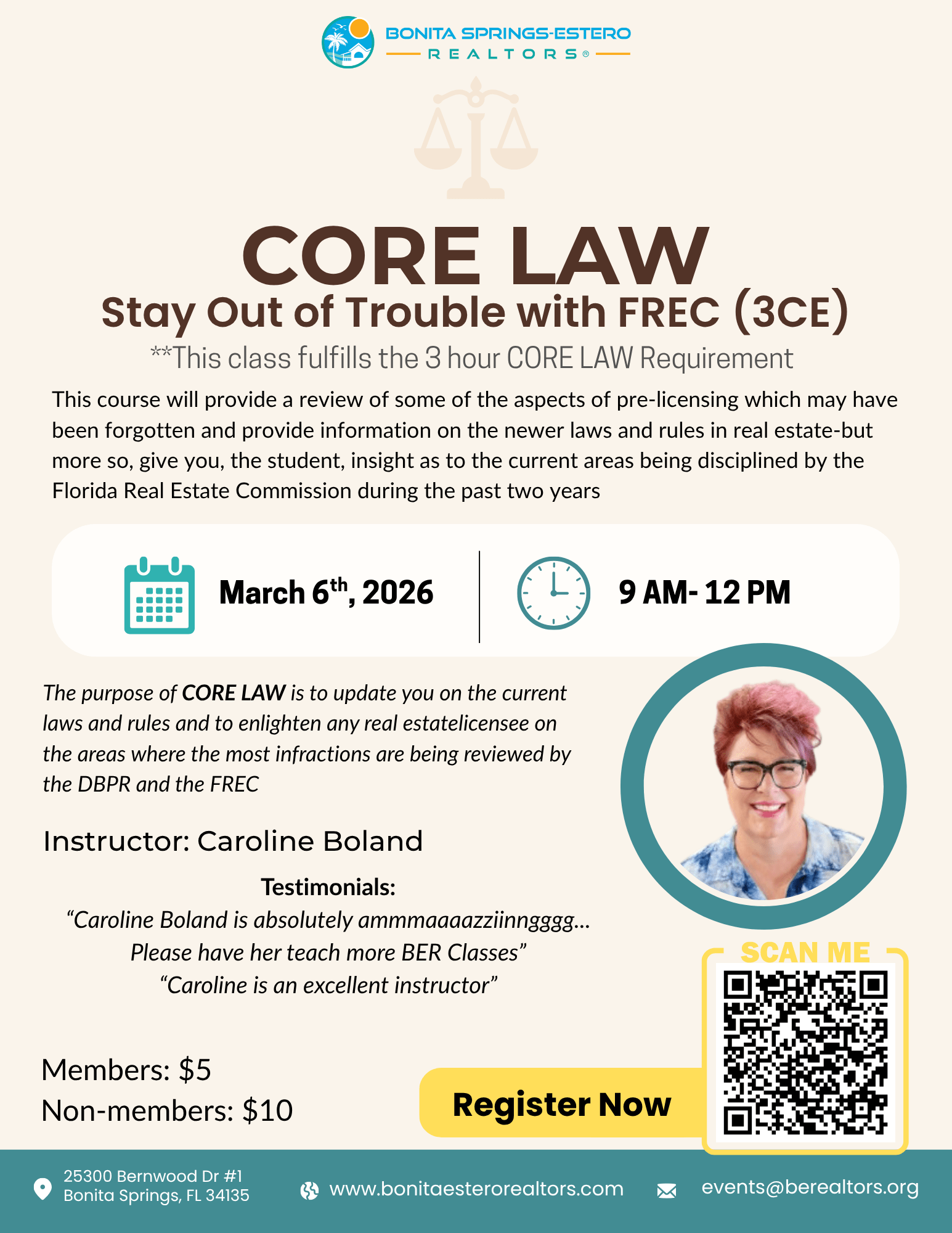 *This class fulfills the 3 Hour CORE LAW requirement* This is the purpose of Core Law –to update you on the current laws and rules and to enlighten any real estate licensee on the areas where the most infractions are being reviewed by the DBPR and the FREC. This course will provide a review of some of the aspects of pre-licensing which may have been forgotten and provide information on the newer laws and rules in real estate - but more so, give you, the student, insight as to the current areas being disciplined by the Florida Real Estate Commission during the past two years. Objectives: After taking this class students will be able to: 1. Describe the minimum Continuing Education courses for license renewal 2. Outline the Florida Real Estate Commission’s Powers and Duties and steps in a potential FREC violation investigation to a final order 3. Identify the importance of Timely Completing A FREC Final order 4. Explain the various rules and Laws which may result in a FREC investigation and appearance in front of the FREC 5. Discuss the two types of license Revocation 6. Classify the difference between Florida Laws, Rules, and Declaratory Statements for enforcement of FREC policies 7. Recall how the Real Estate Recovery Fund is funded 8. Distinguish other Florida State Laws that would affect a real estate licensee which are not enforced by the FREC 9. Summarize other Federal Laws which could cause serious fines or investigation of a sales associate/team/brokerage Instructor: Caroline Boland