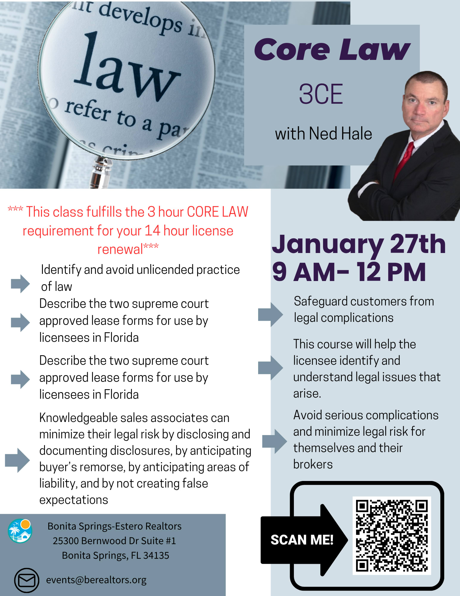 Core Law - Minimize the Legal Risk 3 hours CE Credit • **This class fulfills the 3 Hour CORE LAW requirement for your 14 Hour License Renewal Laws governing real estate are complex and varied. This course provides an advanced look into real estate law beyond the basic sales associates’ course. This course is not designed to make participants legal experts, but rather to help them identify and understand legal issues that arise. The more a licensee knows, the better he or she can work with customers and safeguard them from legal complications. This understanding will also help licensees avoid serious complications and minimize risk for themselves and their brokers. Buying and selling property requires a lot of legal paperwork. Today, more than ever, it’s important to know the laws governing the practice of real estate. Knowledgeable sales associates can minimize their legal risk by disclosing and documenting disclosures, by anticipating buyer’s remorse, by anticipating areas of liability, and by not creating false expectations. Instructor: Ned Hale