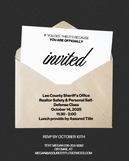 Brew & Boo” Coffee Talk + Special Guest Training with LCSO & Sheriff Carmine Marceno 📍 October 14, 2025 – 1870 Clayton Court, Ft. Myers, FL 33907 •10:00 AM – Coffee Talk Kickoff: Learning & Connection •11:30 AM – LCSO Realtor Safety & Personal Self-Defense (Basic Training) •1:30 PM – LCSO R.E.A.D.Y. Self-Defense Training (Women Only) 👉 Reserved Seating Only - Please RSVP as soon as possible! Text Megan 239-203-9082 or email at Megan@assuredtitleservices.com