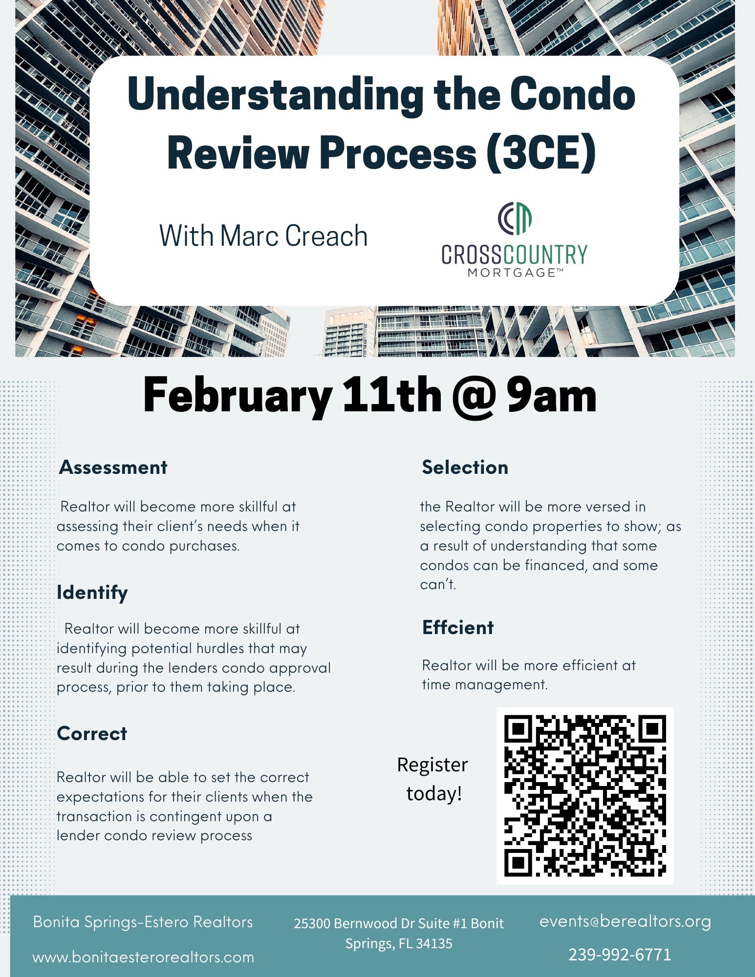First, the Realtor will become more skillful at assessing their client’s needs when it comes to condo purchases. Second, the Realtor will become more skillful at identifying potential hurdles that may result during the lenders condo approval process, prior to them taking place. Third, the Realtor will be more versed in selecting condo properties to show; as a result of understanding that some condos can be financed, and some can’t. Fourth, the Realtor will be able to illustrate their skill in the Florida condo market. We want the client to say, “we are glad we chose he/she, they really know everything there is to know about condos” Fifth, the Realtor will be more efficient at time management. Sixth, the Realtor will be able to set the correct expectations for their clients when the transaction is contingent upon a lender condo review process. Instructor: Marc Creach